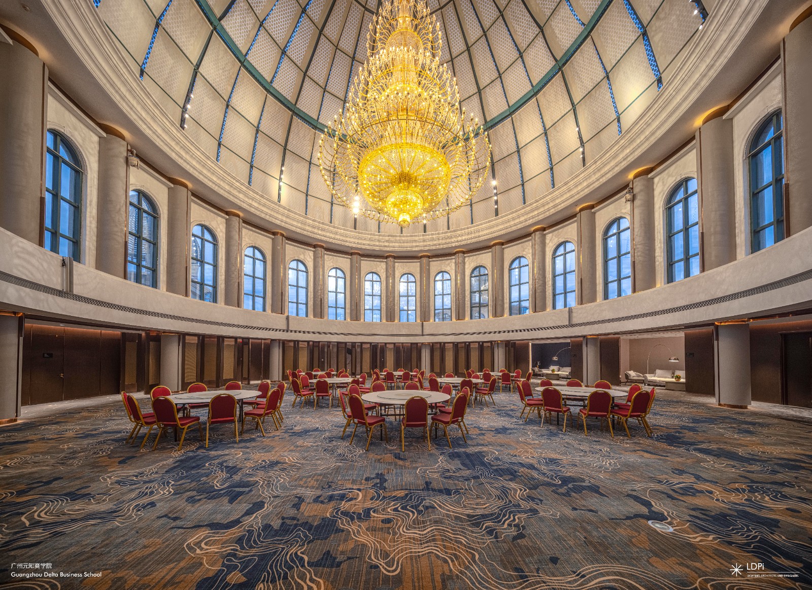 顶层的多功能宴会厅,为学员提供充足空间进行交流、讨论及宴请等活动。穹顶下的大型吊灯烘托了华丽、庄重的氛围。穹顶底部结构上规律安装的射灯以环绕的形式为空间提供补充照明,立柱顶端的装饰性灯光与建筑结构相结合,从视觉上使空间更加丰富。